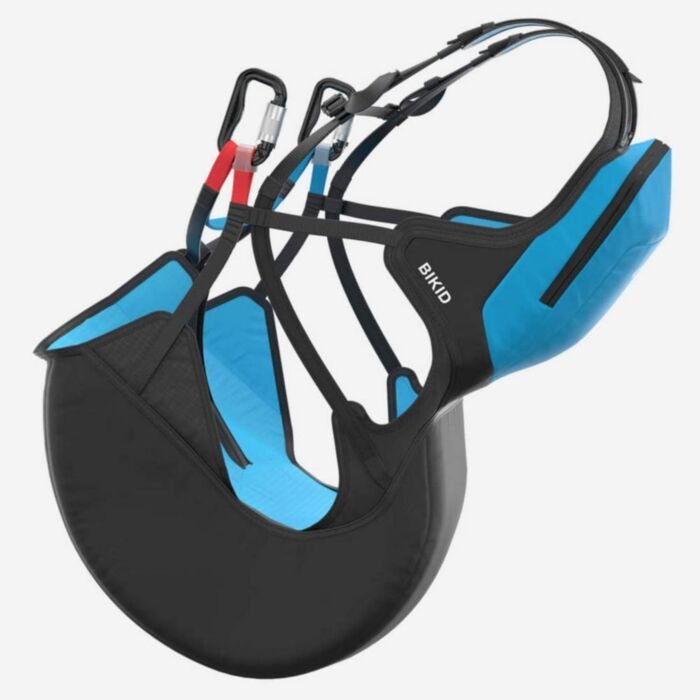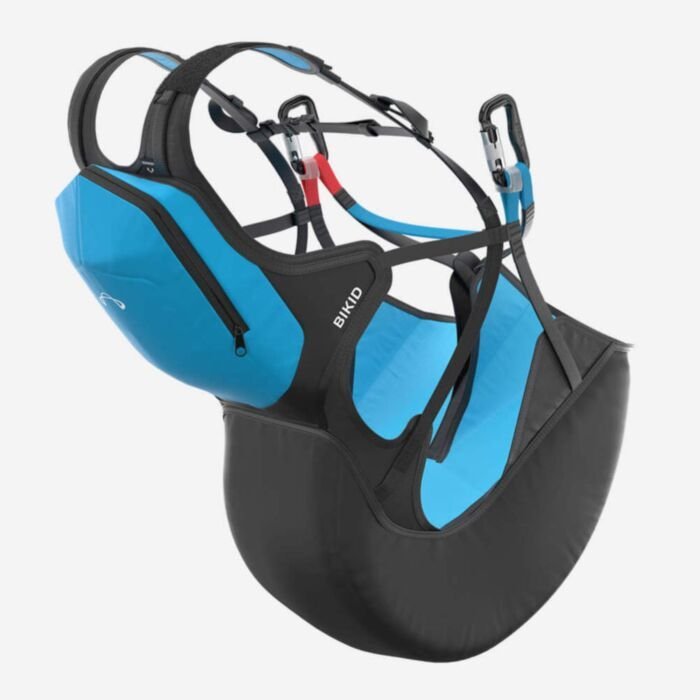 The BIKID can be hooked directly into the main carabiners of a solo paraglider using the extensions supplied. Depending on the size of the kid, you can choose between two distances.