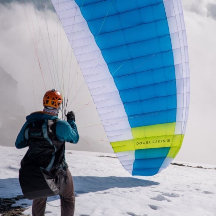 The DOUBLESKIN 2 (EN/LTF A) is aimed at pilots who appreciate a very safe and uncomplicated lightweight glider with smooth handling and a small pack size. Thanks to its suitability for training, the DOUBLESKIN 2 offers a great deal of confidence and flying fun from the very first flight. The classic application is hike & fly in all its facets. Depending on the wing loading and choice of size, the DOUBLESKIN 2 can also be used for relaxed thermalling. In size 16, with a high wing loading, the DOUBLESKIN 2 can even be flown as an agile ultra-light miniwing – it is certified as EN B in the extended weight range of 80 to 95 kg.