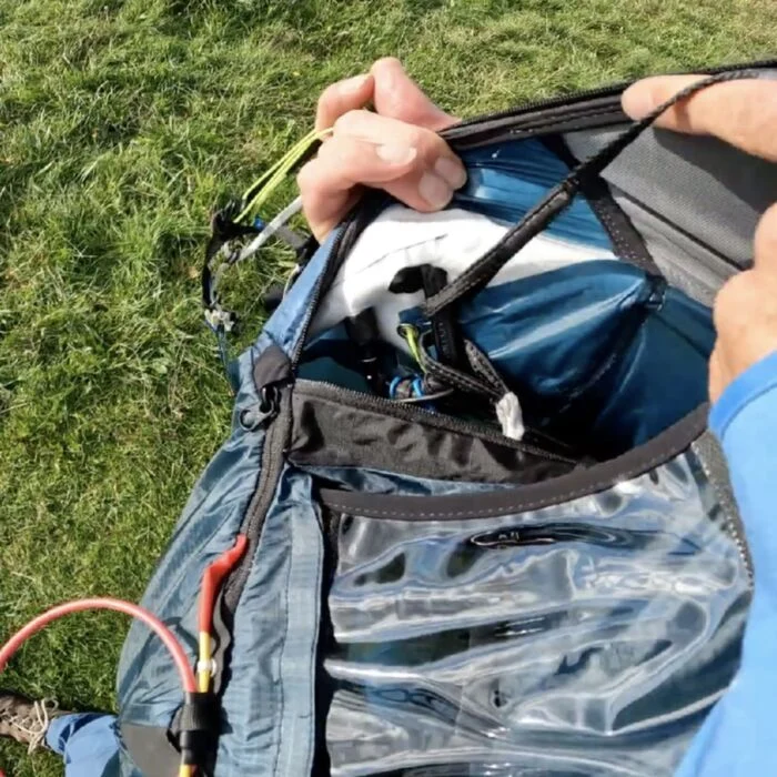 To settle into the harness after take-off, all you have to do is insert your legs into the cocoon and extend them, so that Zipper closes automatically by magnetic force alone. Once closed, the seal is Warranty and the envelope inflates thanks to the relative wind.