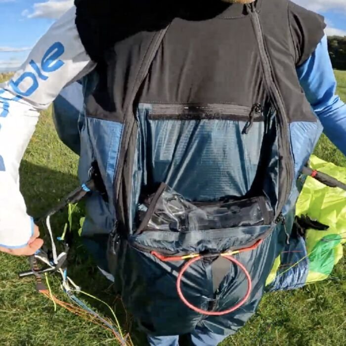 The alp protection takes up no space in the bag, and inflates in seconds on takeoff via a hose on the left shoulder of the harness.